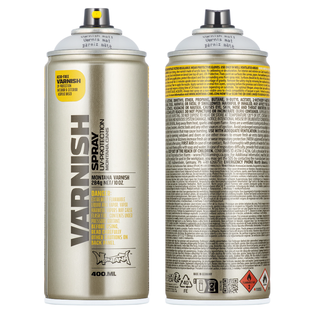 Poziom połysku pokazany na pączku (patrz góra puszki). Zabezpiecza i utrwala farbę na powierzchniach takich jak płótno, papier, rysunek węglowy, włókno łykowe, drewno, zdjęcia itp. Zabezpiecza przed utlenianiem i promieniowaniem UV. Im więcej nałożonych warstw, tym silniejsza ochrona UV. Podczas aplikacji chronić przedmiot i okolice przed rozpryskami. Powierzchnie przed nałożeniem lakieru powinny być suche, oczyszczone z kurzu, olejów i rdzy.